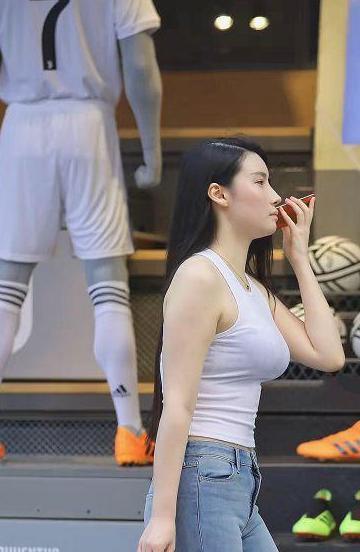 接着我们再来看这位美女,显然这位美女在忙着打电话,但是确实还是被美女的好身材给吸引了,美女身穿白色无袖紧身上衣,搭配着紧身的浅蓝色牛仔短裤,搭配虽然简单,但是这简单的搭配,把整人的玲珑曲线都充分的衬托了起来,整个人显得非常的有女神范,上身傲人的胸围更是抢眼,真的是应了那句话,身材好真的是穿什么都好看!