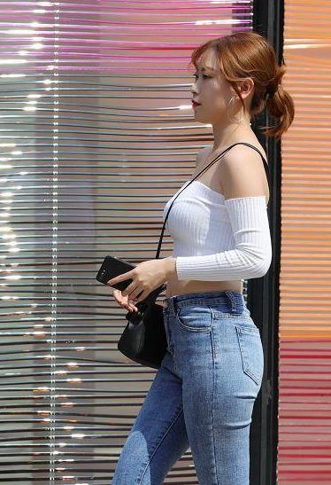 最后我们再来看这位美女,从美女的体型上来看,这位美女是属于那种微胖型的,是很有肉感的那种女生,从美女的走路姿势来看,这个美女非常的有气质,这个美女可以说绝对是微胖界的女神,美女身穿露肩露腰的白色紧身衣,搭配着下身的浅蓝色牛仔裤,这身装扮把美女的身材显现的淋漓尽致,散发出浓浓的女人味,绝对是回头率超高的存在!