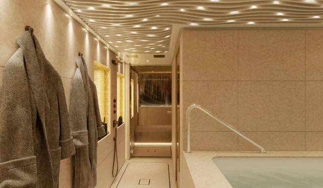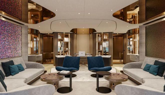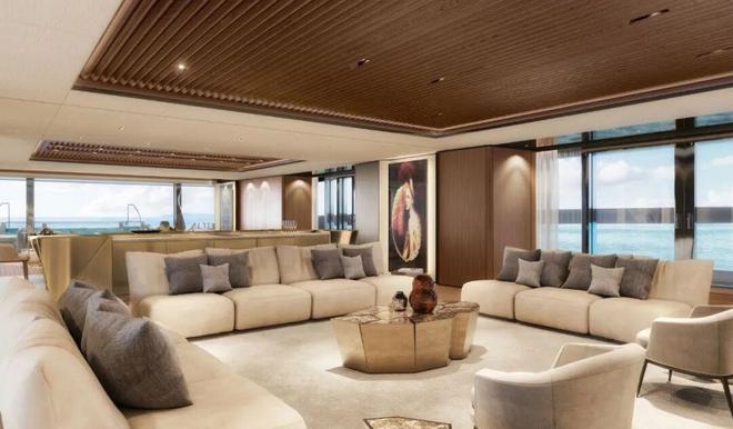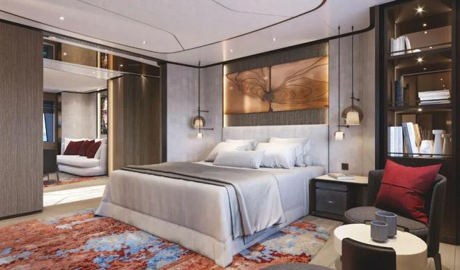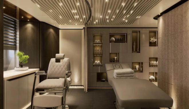 这种配置使得内部布局更加灵活,特别是在海滩俱乐部和水疗区,当船尾和侧平台展开时,面积可接近290平方米。