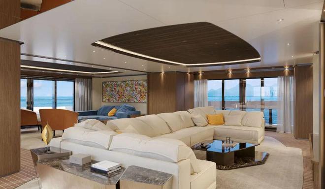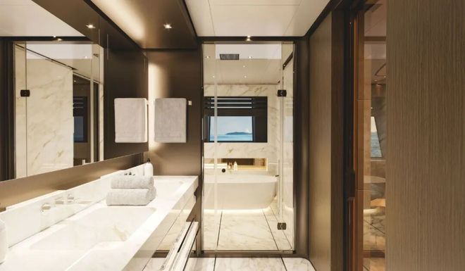 她以流畅的船体线条和垂直的船首为特色,赋予了这艘游艇独特的轮廓。步入船内,其内部装饰现代而精致,配有弧形家具、雕刻造型和哑光木质饰面,其套间浴室还采用了多种大理石材质加以点缀。